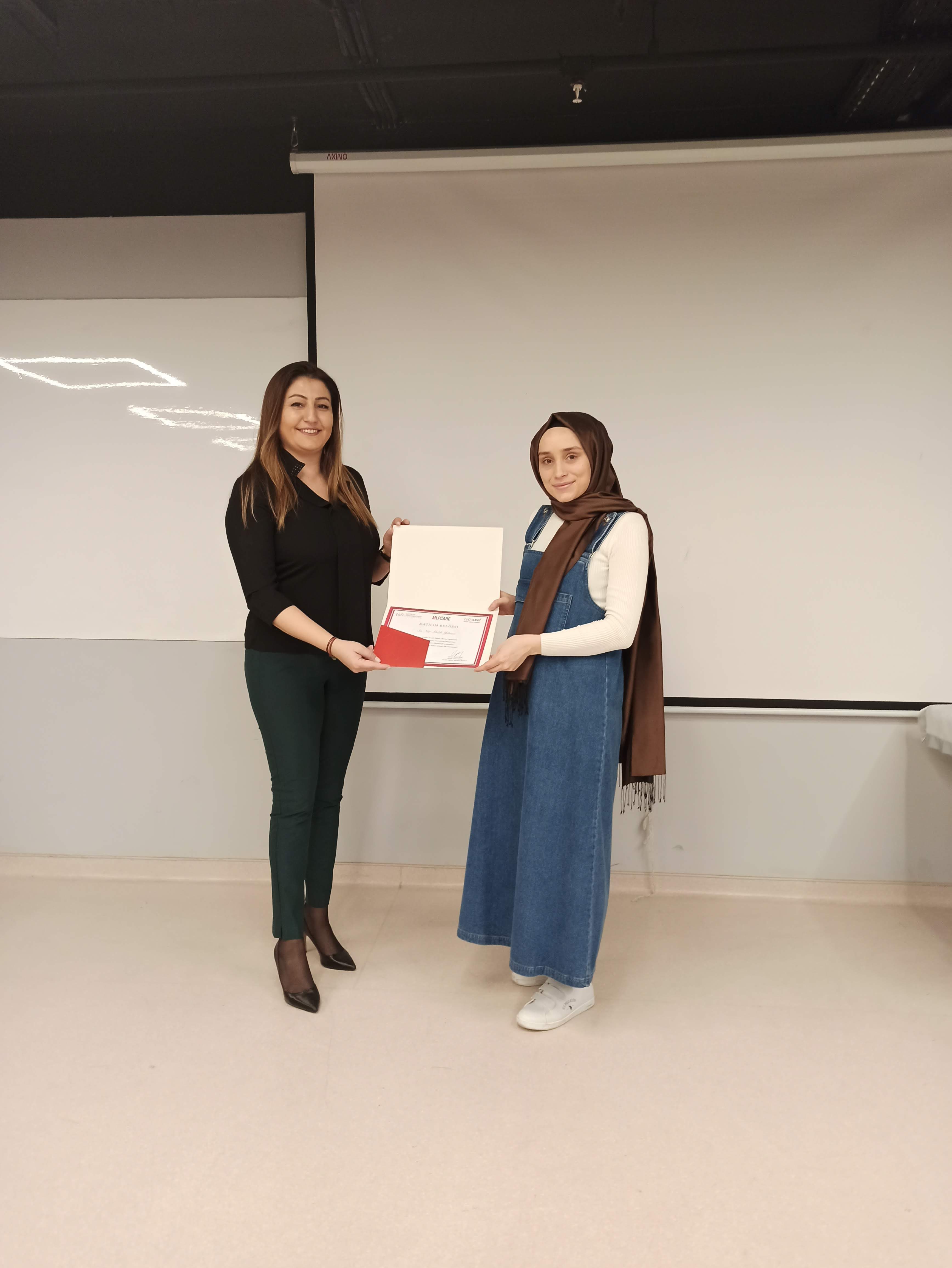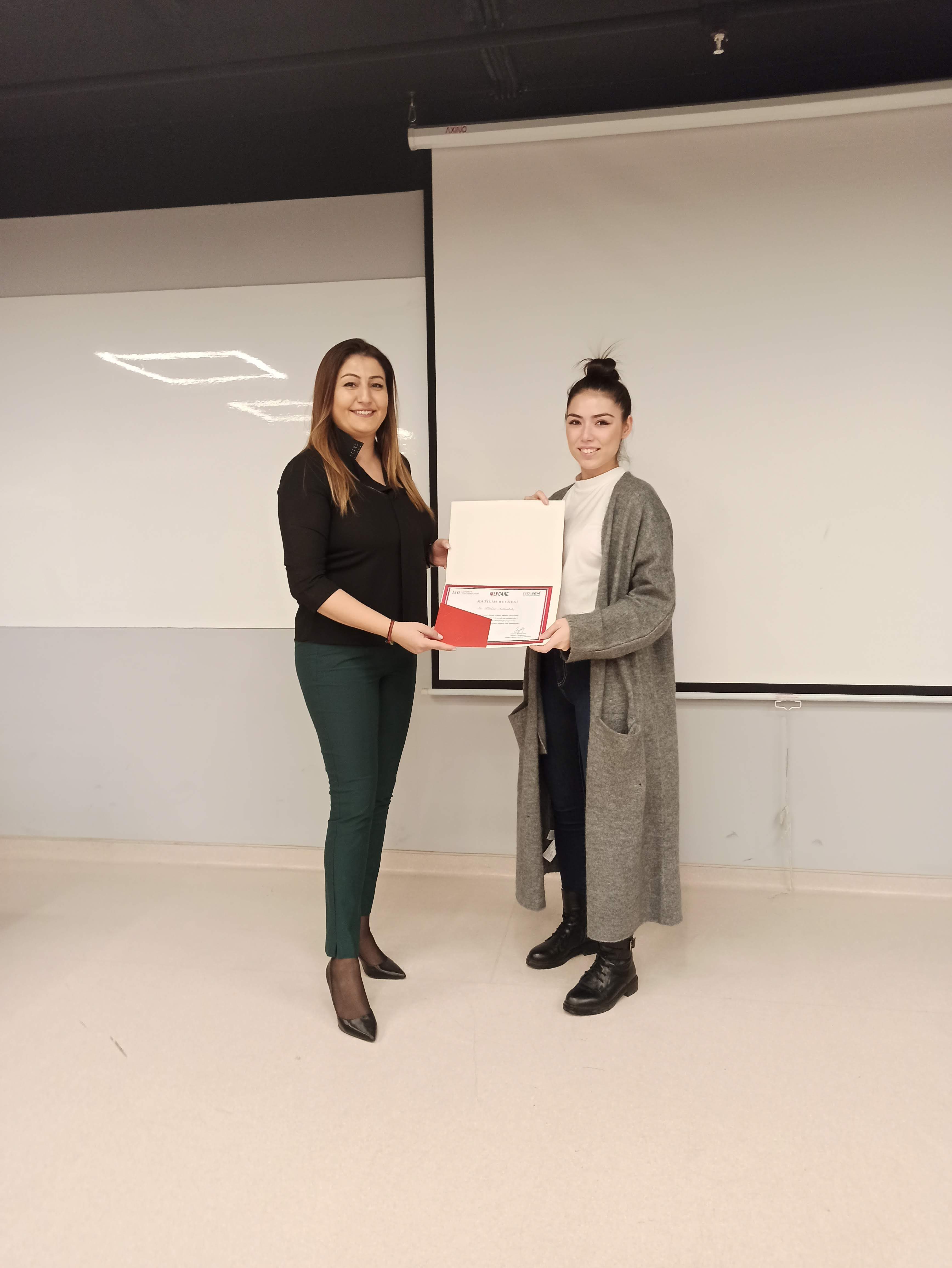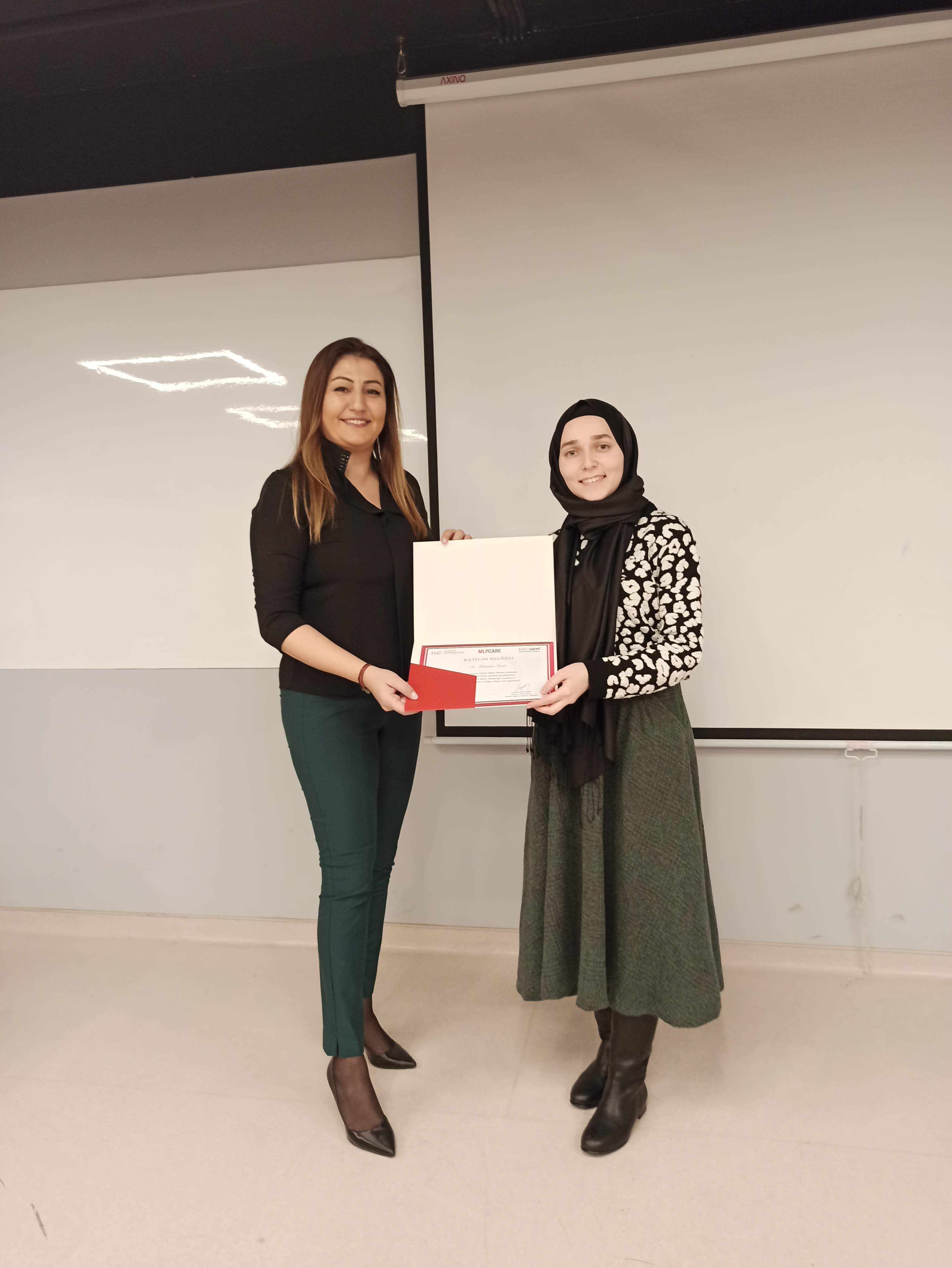 Başarılı olan katılımcılara belgelerini, MLP Care Hemşirelik Hizmetleri Direktör Yrd. Emel Gümüş, İSÜ Sağlık Bilimleri Fakültesi Dekan Yardımcısı Dr. Öğr. Üyesi Refika Genç, İSÜ İngilizce Hemşirelik Bölüm Başkanı Dr. Öğr. Üyesi Zehra Aydın, Uzm. Hemş. Nuray Çakmak, MLP Care Gelişim Akademisi İnsan Kaynakları Eğitim Müdürü ve İSÜSEM Müdürü Ceylan Adıgüzel takdim etti.