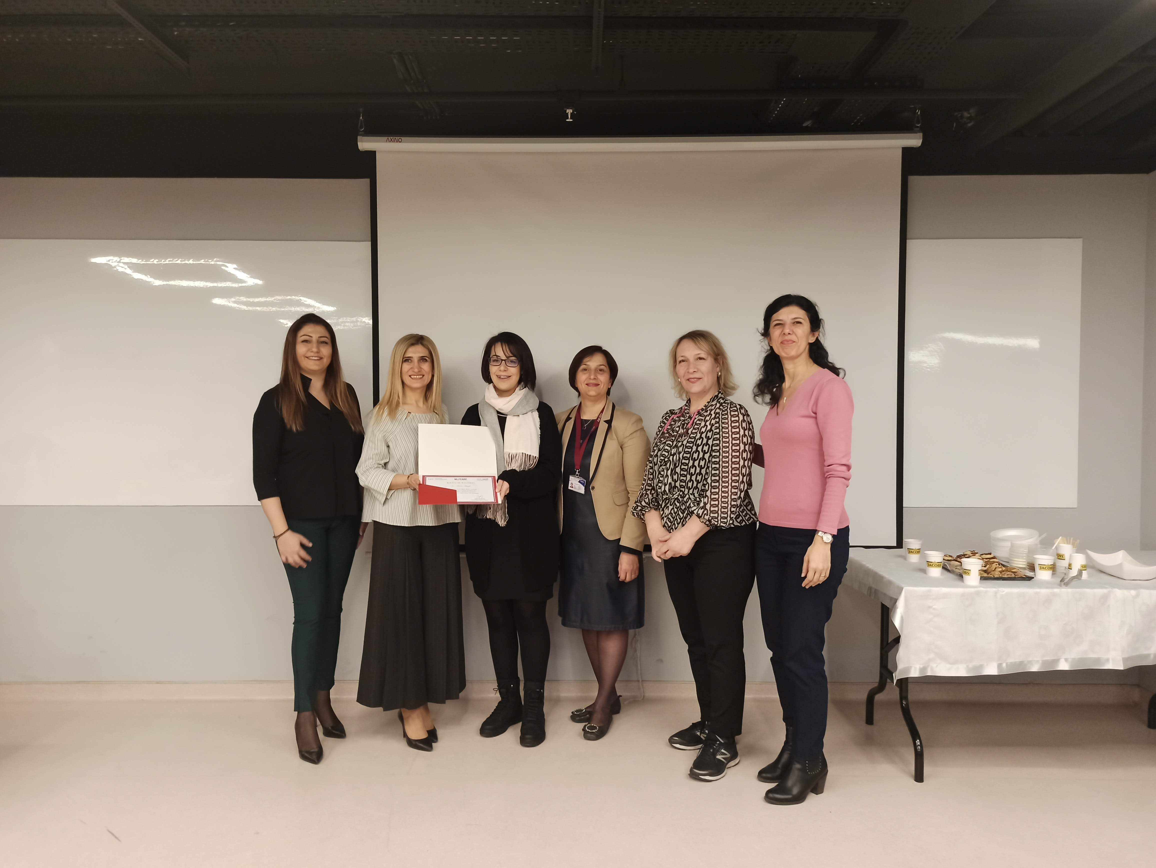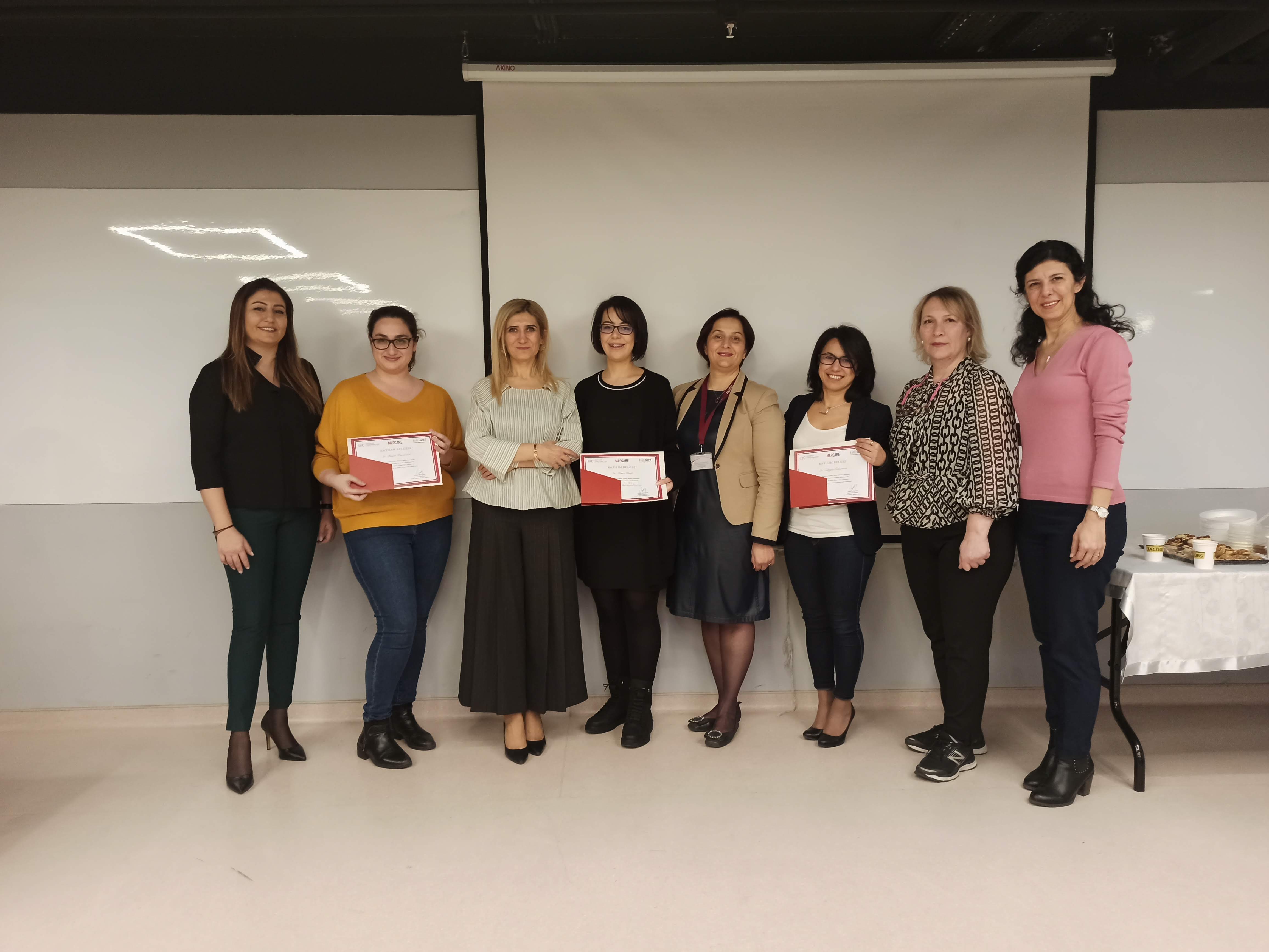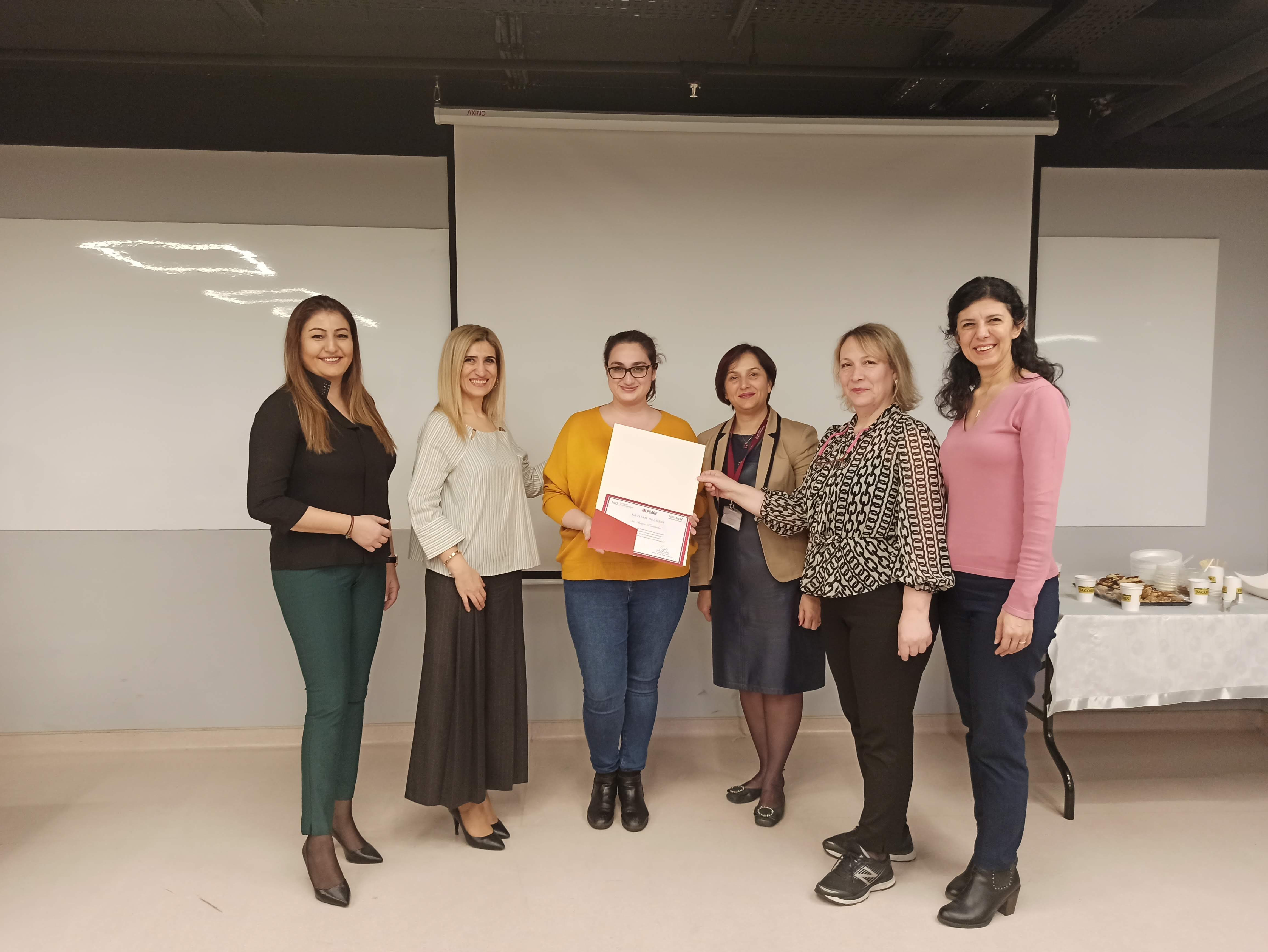 Başarılı olan katılımcılara belgelerini, MLP Care Hemşirelik Hizmetleri Direktör Yrd. Emel Gümüş, İSÜ Sağlık Bilimleri Fakültesi Dekan Yardımcısı Dr. Öğr. Üyesi Refika Genç, İSÜ İngilizce Hemşirelik Bölüm Başkanı Dr. Öğr. Üyesi Zehra Aydın, Uzm. Hemş. Nuray Çakmak, MLP Care Gelişim Akademisi İnsan Kaynakları Eğitim Müdürü ve İSÜSEM Müdürü Ceylan Adıgüzel takdim etti.