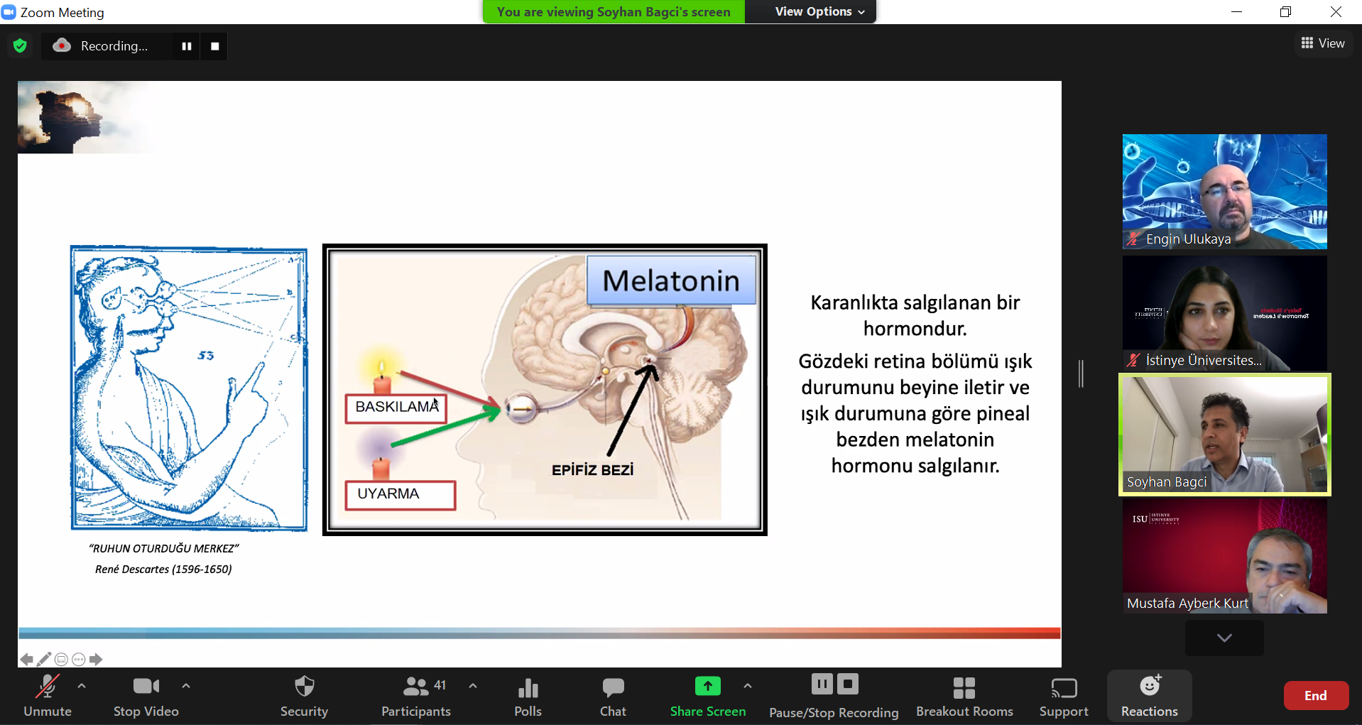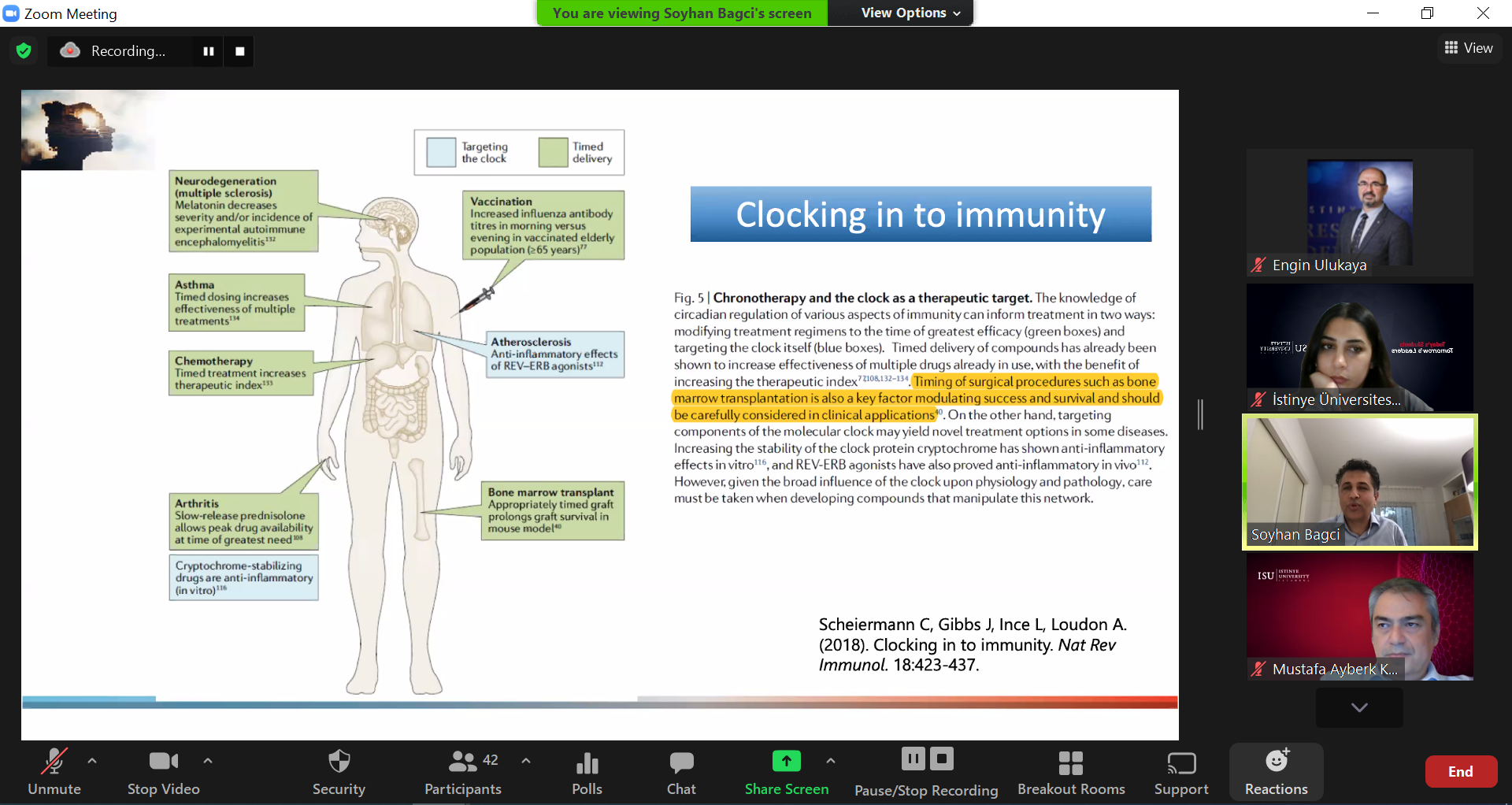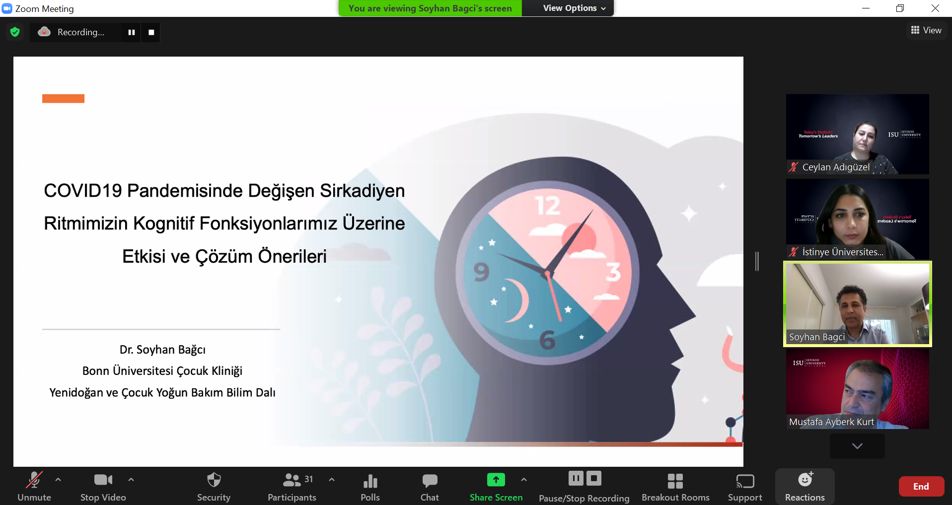 İstinye Üniversitesi Sürekli Eğitim Merkezi (İSÜSEM) tarafından düzenlenen ve Bonn Üniversitesi Öğretim Üyesi Dr. Soyhan Bağcı’nın konuşmacı olarak katıldığı Covid19 Pandemisinde Değişen Sirkadiyen Ritmimizin Kogniftif Fonksiyonlarımız Üzerine Etkisi etkinliği, çevrim içi olarak gerçekleşti.
